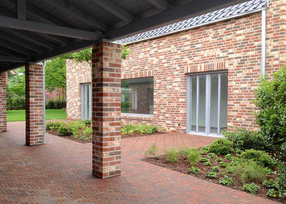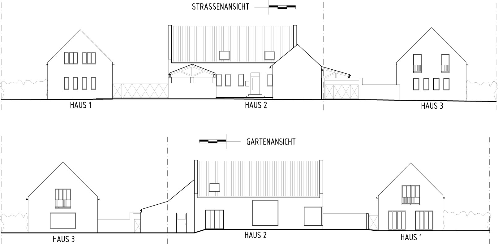 Wiederum drei Jahre nach Fertigstellung von Haus 2 ergab sich die Möglichkeit zum Erwerb des folgenden unbebauten Nachbargrundstücks. An die 16 m lange Grenzwand der Scheune von Haus 2 lehnt sich jetzt ein Carport mit einem Abstellraum an. Der bildet mit dem parallel dazu stehenden Wohnhaus einen Innenhof mit gepflasterten Terrassen vor Wohnraum und Essplatz und großen Beeten in der Art eines Bauerngartens. Auch in diesem Haus ist der Grundriss des Erdgeschosses weitgehend offen, mit großen Panoramafenstern zum Innenhof und auf einen alten Nussbaum im rückwärtigen Garten. Die Materialien sind die gleichen, wie in Haus 1 und 2: rotbunte Mauerziegel, rotes Ziegelpflaster, zimmermannsmäßige Holzkonstruktion für die Remise. Das Ensemble aus drei Einfamilienhäusern und deren Nebengebäuden nimmt viele Elemente der traditionellen niederrheinischen Bauernhöfe der Umgebung auf.
